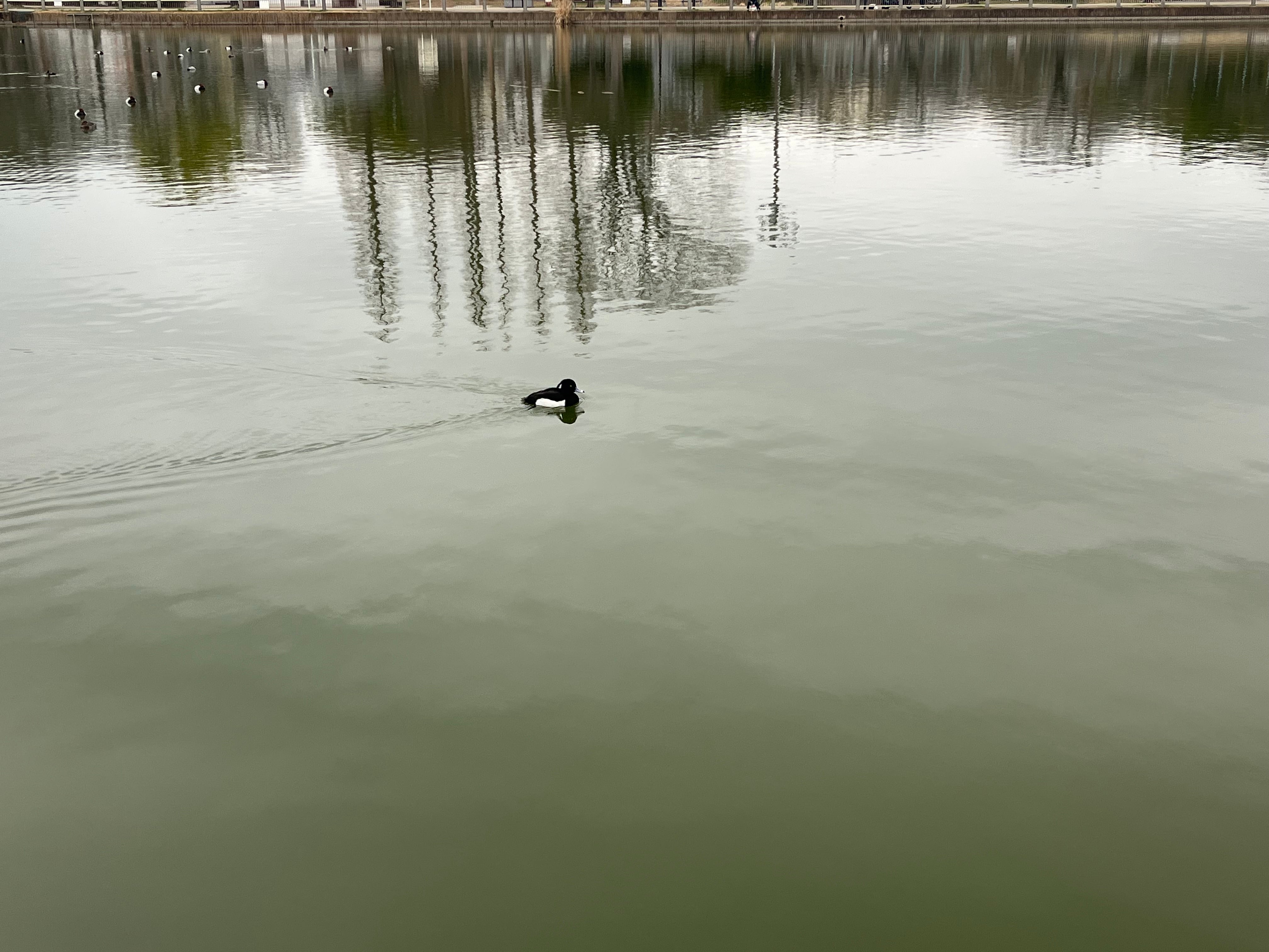 公園の湖にいるホシハジロ御一行1匹だけすーっと1人泳ぎ